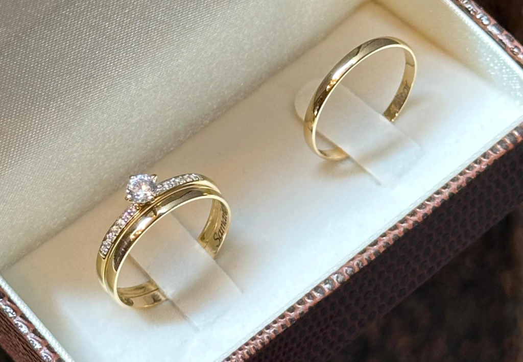 Feito inteiramente com o precioso ouro 18k, tem um design bonito e moderno que fica perfeito com qualquer estilo. O modelo possui a largura de 2mm e espessura aproximada de 0,60mm, já o Solitario o peso varia entre 1,25gr de acordo com a numeração de aliança escolhida pelo cliente. O detalhe maior fica por conta do anel Solitario com lindas pedras de Zircônia.